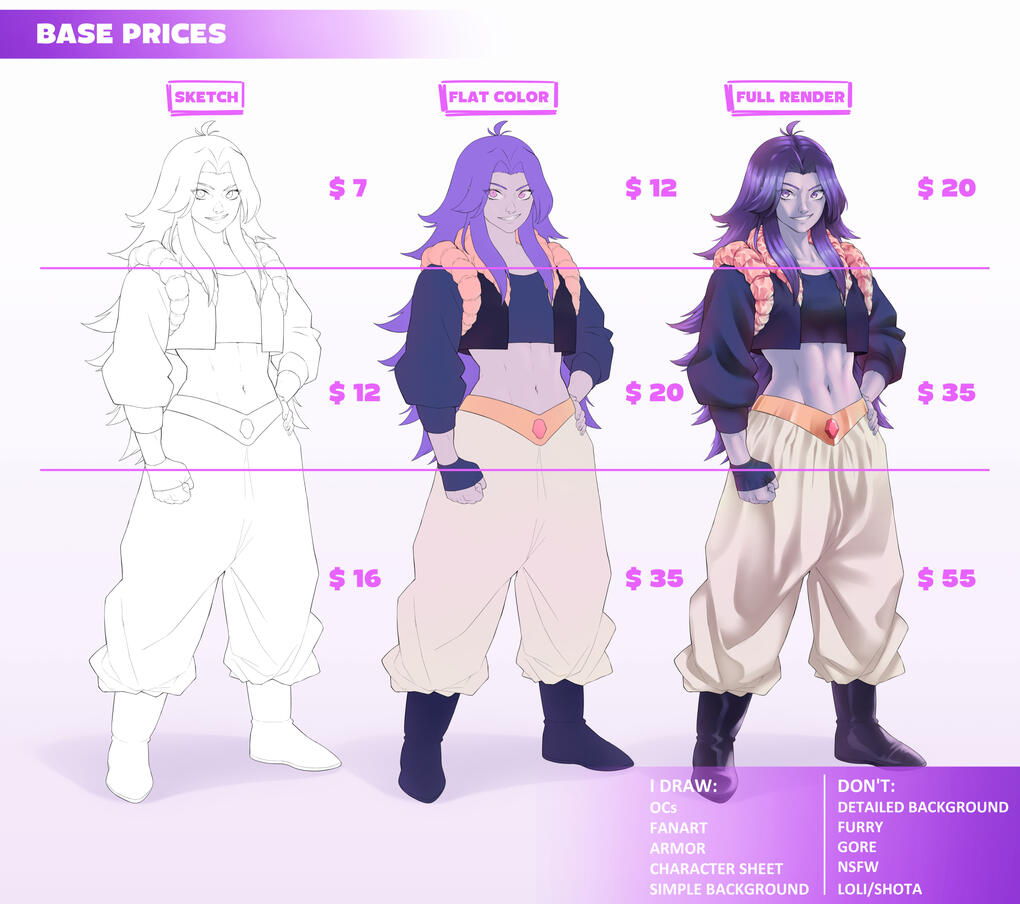 · All commissions are for personal use only. You are welcome to use the artwork as a profile picture or banner, but it may not be used for any commercial or profit-related purposes.· I retain full copyright over all works I create, and under no circumstances may my artwork be uploaded into AI engines.· Unless requested otherwise, I reserve the right to share the finished piece on my social media and to include it in my portfolio.· Please note that unless exclusive rights are purchased, I retain ownership of all artwork and may use it for prints, online sales, marketing, publications, merchandise, and other forms of monetization.· The prices listed are base rates only. The final cost may vary depending on the complexity of the commission and the level of detail requested. I reserve the right to decline any commission if I feel the request is outside my skill set or involves subject matter I do not accept.· Standard turnaround time is up to two months to account for unforeseen circumstances. Rush orders with a fixed deadline will incur additional fees. I dedicate many hours to ensuring quality and detail in every piece, so I kindly ask for patience throughout the process. Progress updates are usually provided at three stages: the initial sketch, flat colors, and the final review. If you have not received an update in some time, you are always welcome to request one.· Reposting and sharing the finished artwork is allowed, provided proper credit is given. To guarantee accuracy and avoid mistakes, visual references are required. Non-visual references may result in additional charges or may not be accepted.· During the process, I will send progress images (including sketch and, if necessary, flat colors) for your review. Once the sketch is approved, refunds are no longer possible unless I decide otherwise. At the final stage, you may request up to three minor revisions free of charge. Any additional revisions beyond this limit will incur an extra fee. Once the commission is finalized and approved, I will provide you with high-resolution .png and .jpeg files. Please note that no physical products are shipped.· By commissioning me, you confirm that you have carefully read, understood, and agreed to all of the terms stated above.